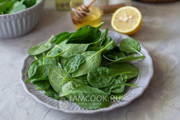 Свежие листья шпината помойте и обсушите. Переложите в салатник.