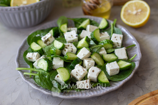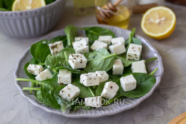 Полейте салат со шпинатом и сыром фета приготовленной заправкой и сразу подавайте! Приятного аппетита!