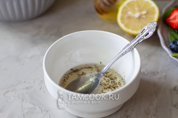 Для заправки смешайте оливковое масло, сок лимона, мед, орегано, соль и черный молотый перец.