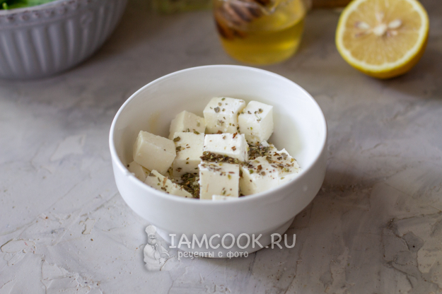 Сыр Фета нарежьте небольшими кубиками, сложите в небольшую мисочку. Добавьте немного сушеного орегано и ложку оливкового масла. Оставьте настояться минут на 5-10.