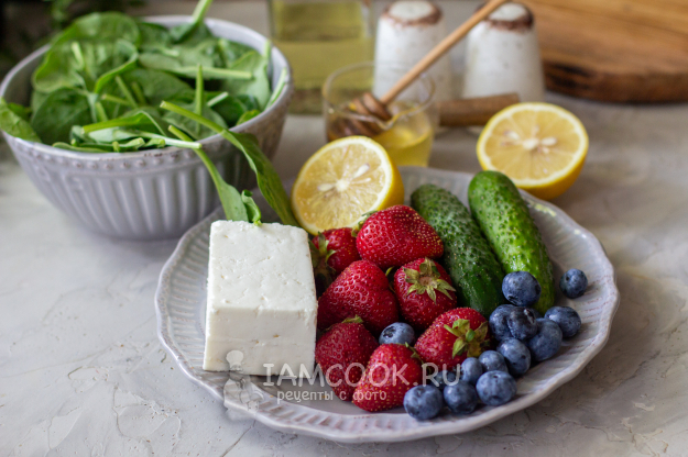 Соберите необходимые продукты для приготовления салата со шпинатом и сыром фета.