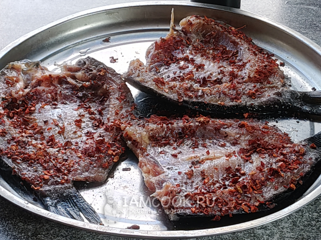 Тонким слоем посолить рыбу, а если нравится, то и поперчить.