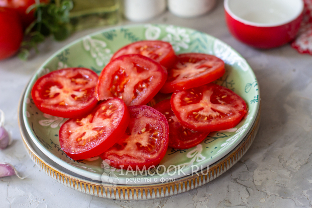 Смажьте каждый кружочек помидора майонезом с чесноком.