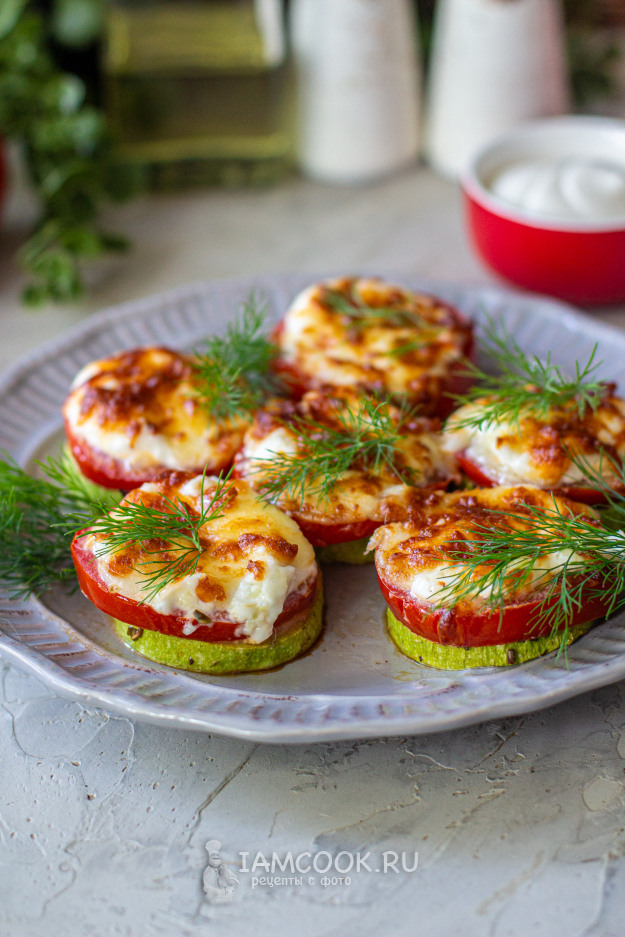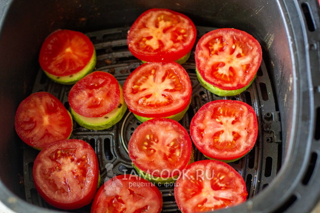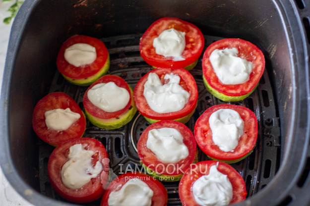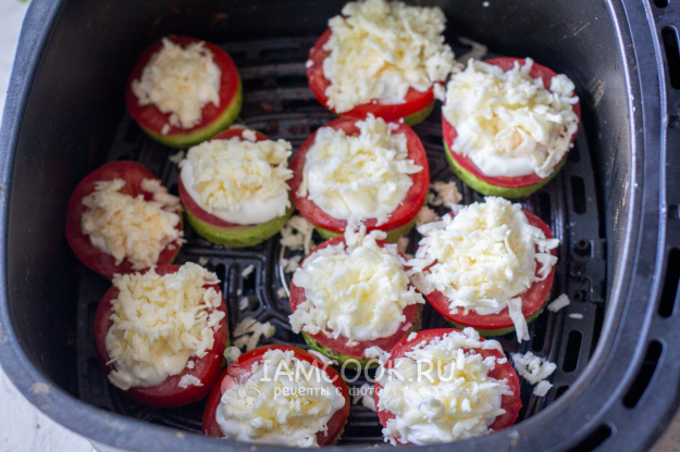 Сверху горкой выложите тертый сыр. Готовьте кабачки с помидорами в аэрогриле еще 5-7 минут при температуре 180-190 градусов, до румяности сыра.
