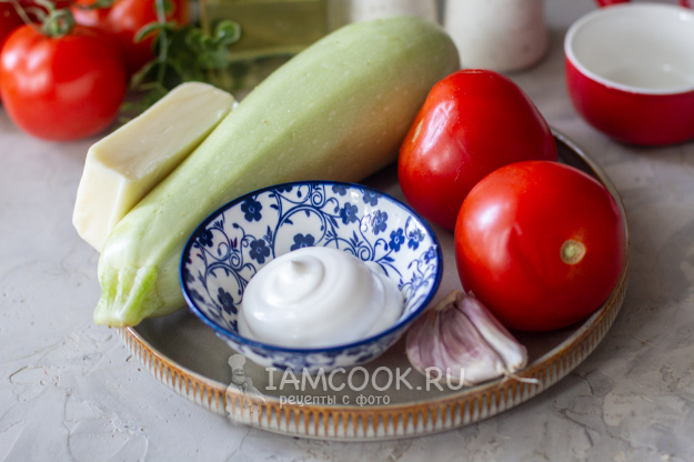 Для запекания кабачков с помидорами в аэрогриле соберите продукты по списку. Овощи помойте под проточной водой, обсушите бумажными полотенцами.