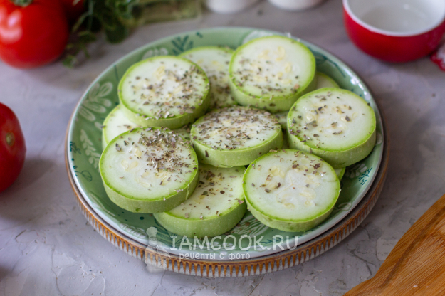 Кабачки нарежьте кружочками толщиной в 0,5 сантиметра. Переложите в подходящую емкость, добавьте сушеные травы и ложку растительного масла. Перемешайте, чтобы масло со специями распределилось по всем кабачкам.