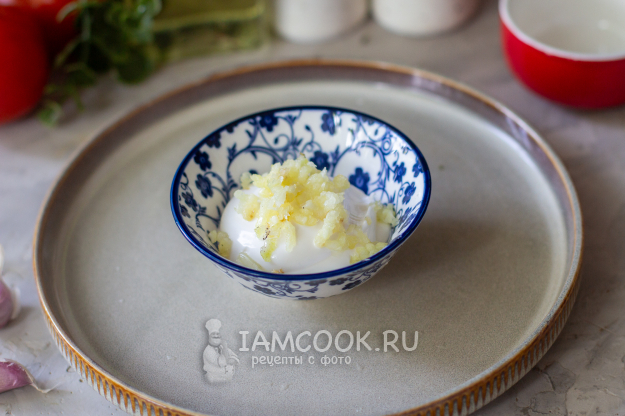 Майонез смешайте с чесноком, пропущенным через пресс. Сыр натрите на терке.