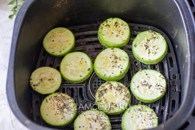 В чашу аэрогриля в один слой выложите кружочки кабачков. Готовьте их 10 минут при температуре 180-190 градусов.