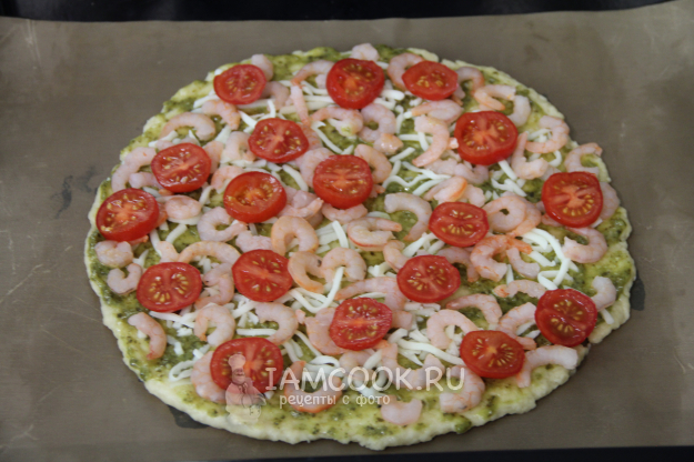 Креветочки заранее разморозить. Выложить креветки на тесто.