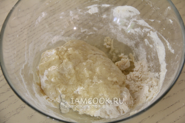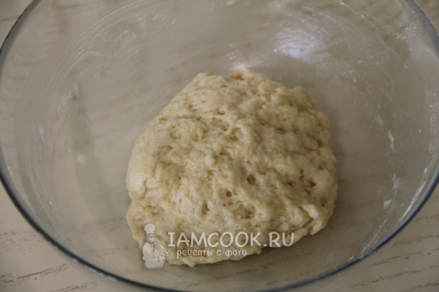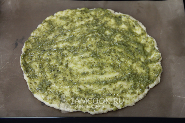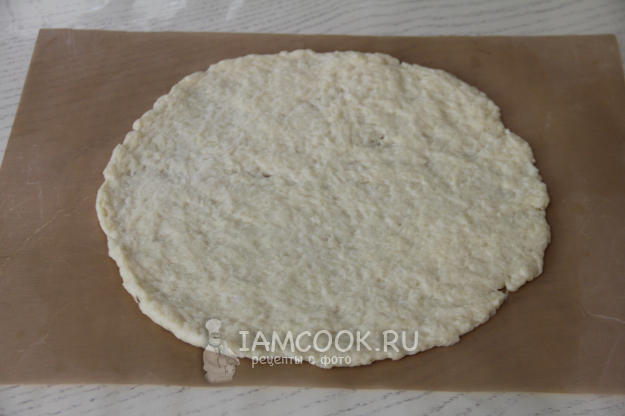 Раскатать тесто скалкой, сразу на тефлоновом коврике или пергаменте. У меня получился круг диаметром 28 см.