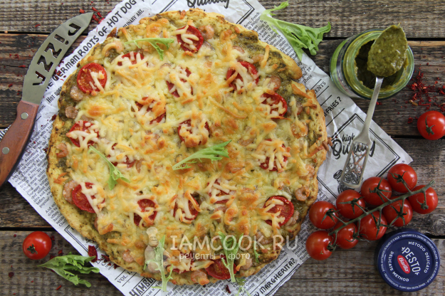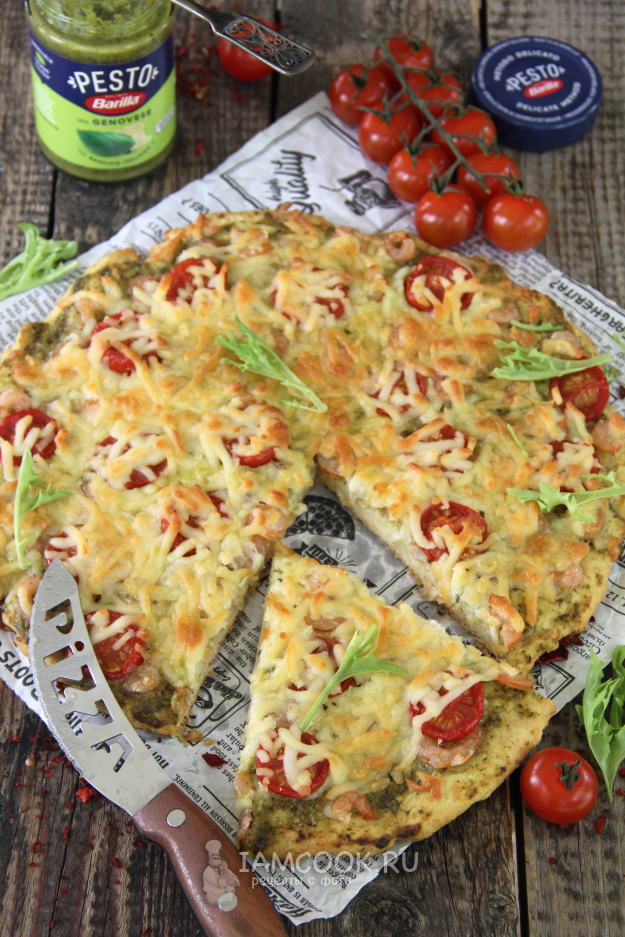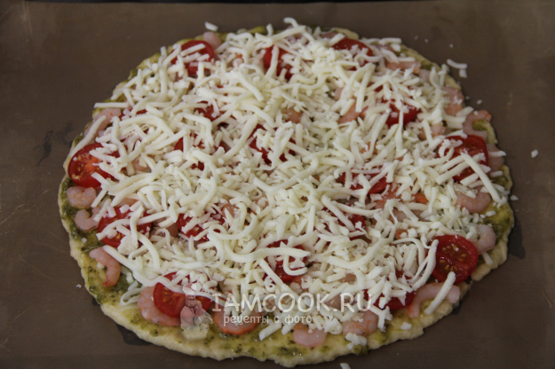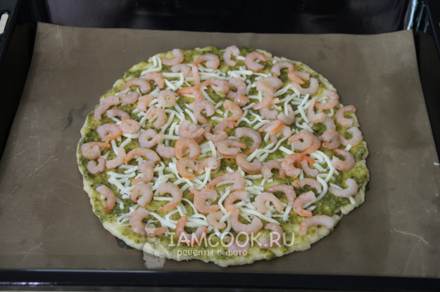 Выпекать пиццу с креветками и соусом песто в разогретой до 210 градусов духовке примерно 12-15 минут.