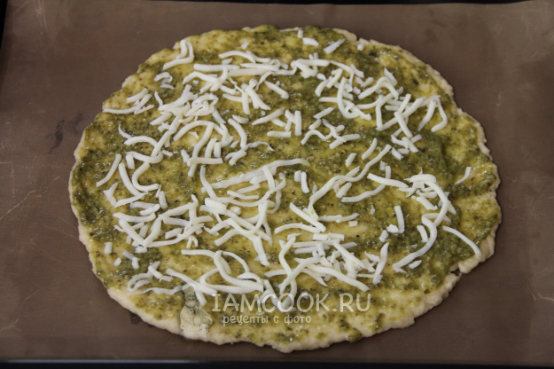 Присыпать пиццу сыром. Можно использовать моцареллу, сулугуни или любой сыр.