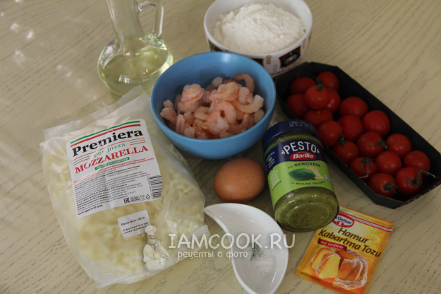 Соберите продукты для приготовления пиццы с креветками и соусом песто.