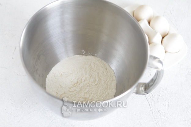 В чашу для замеса просейте муку. Добавьте сахар, соль, слегка перемешайте сухие ингредиенты.