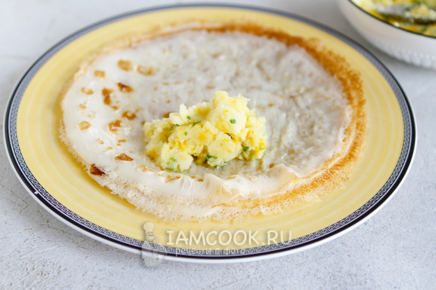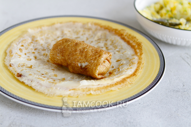 В центр блина выложите начинку - 1.5 ст.л. Сверните блин удобным для вас способом, конвертиком или в виде рулета.