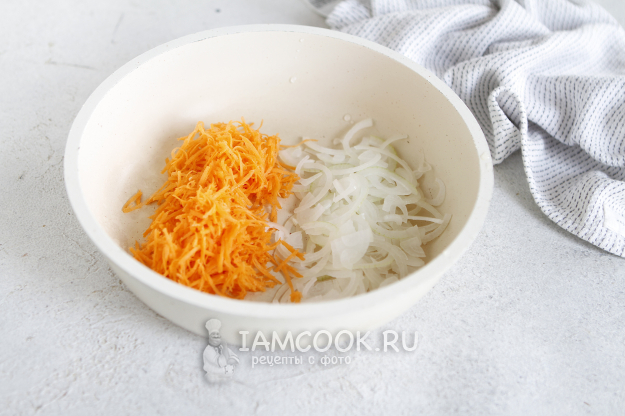 Разогрейте сковороду с растительным маслом и обжарьте лук с морковью до мягкости.