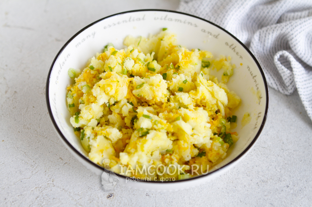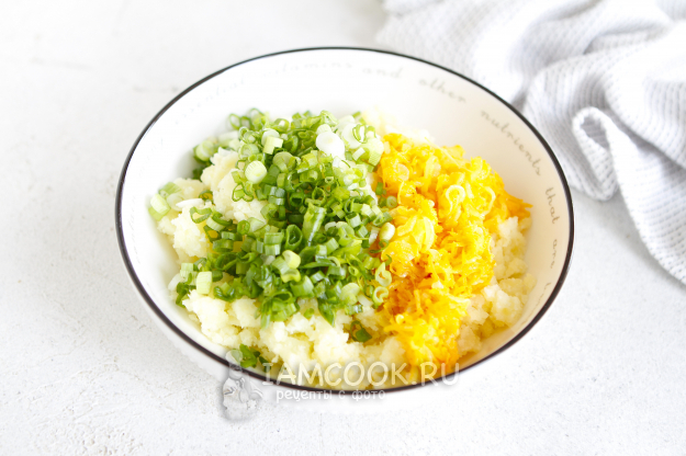 Добавьте в картофель лук с морковью и мелко нашинкованный зеленый лук.