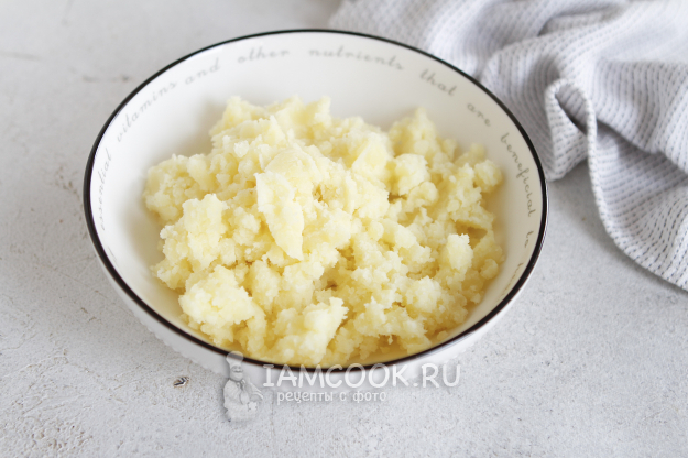 Как только картофель будет готов, слейте воду и разомните его толкушкой.