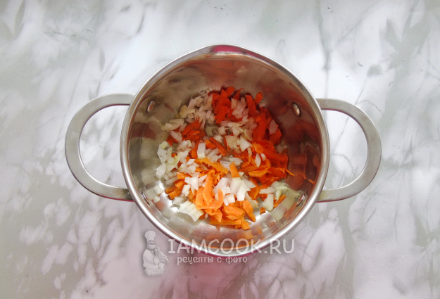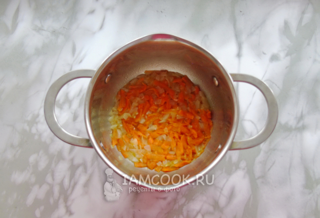 Репчатый лук мелко нарежьте. Морковь натрите на терке. Выложите в кастрюлю с толстым дном. Налейте растительное масло.