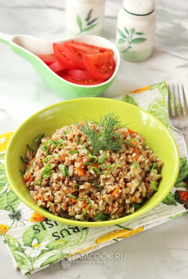 Гречневую крупу промойте в проточной воде. Добавьте в кастрюлю с овощами. Залейте водой и посолите.