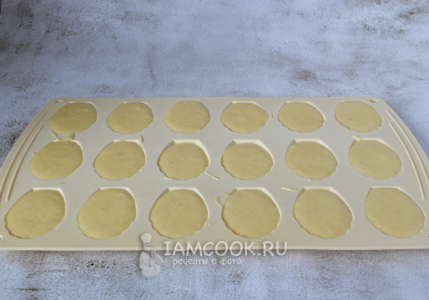 За 30 минут до приготовления форму для печенья «Мадлен» поместить в морозилку. Духовку разогреть до 200°С (конвекция). Достать тесто из холодильника и заполнить им формочки.
