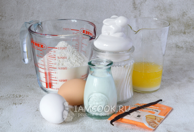 Соберите необходимые ингредиенты для приготовления печенья «Мадлен» по классическому рецепту. Яйца и молоко нужно заранее достать из холодильника. Сливочное масло растопить и остудить до комнатной температуры.