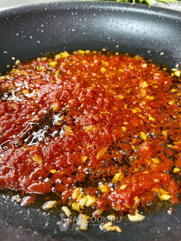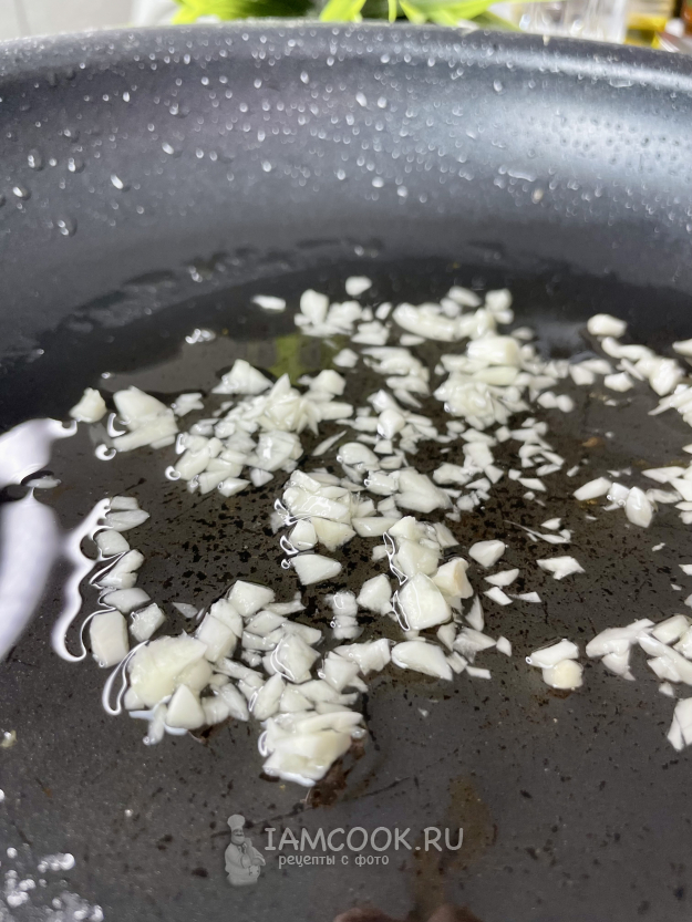 Вынимаем яйца и обжариваем мелко нарезанный чеснок.