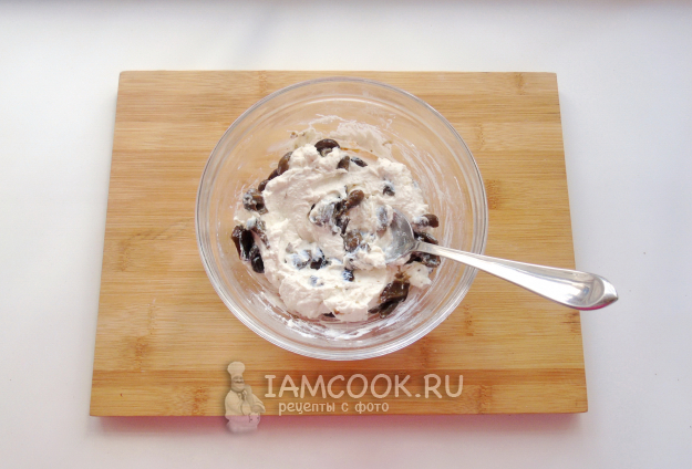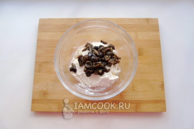 Перемешайте творог с грибами.