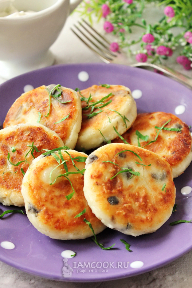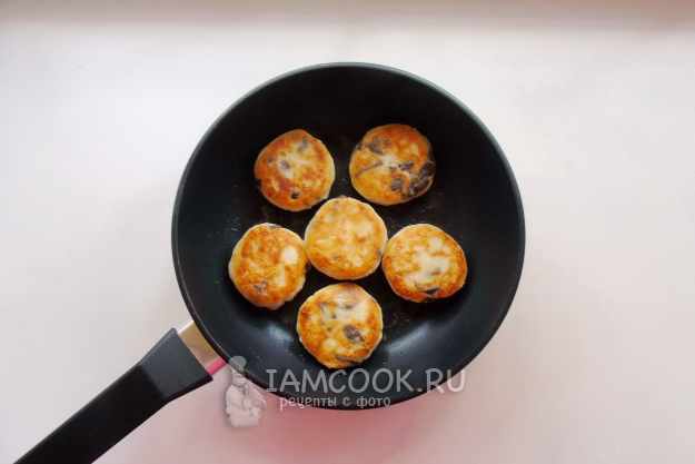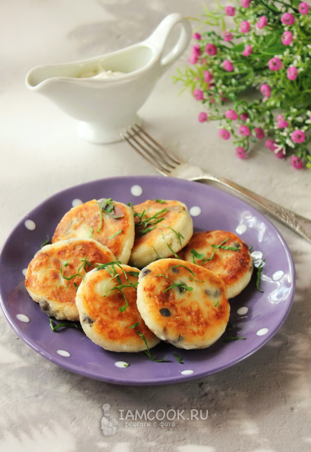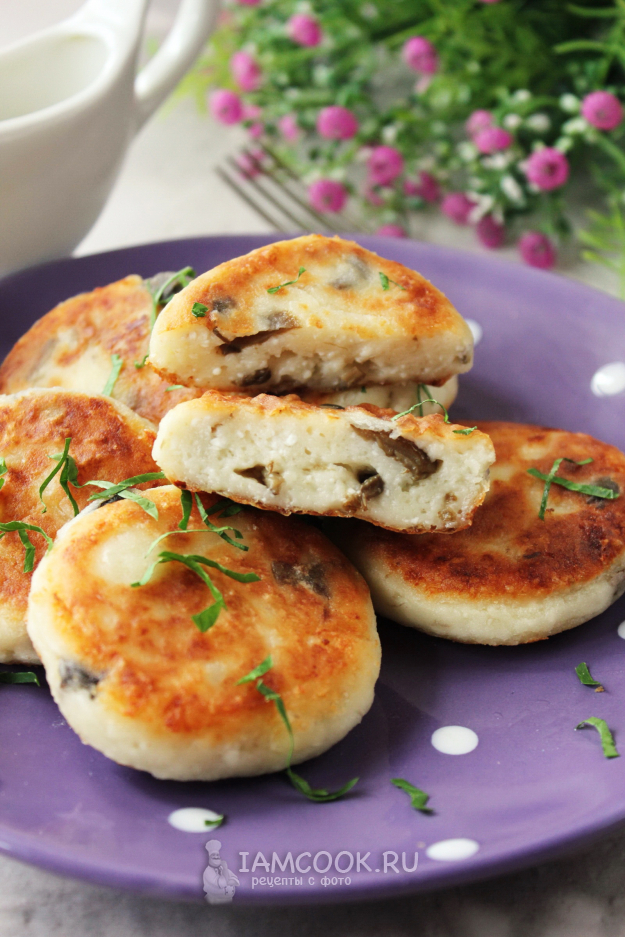 Румяные, аппетитные сырники с грибами готовы. Подавайте со сметаной, соусами.