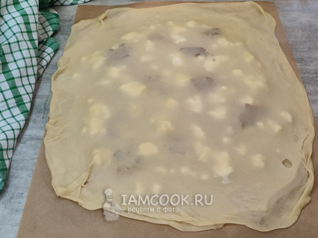Накройте вторым пластом теста. Края, конечно, можно подогнуть, завернуть было, я решила их обрезать.