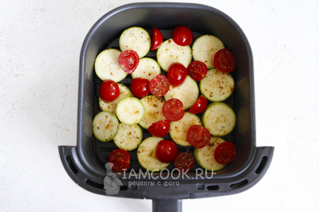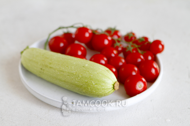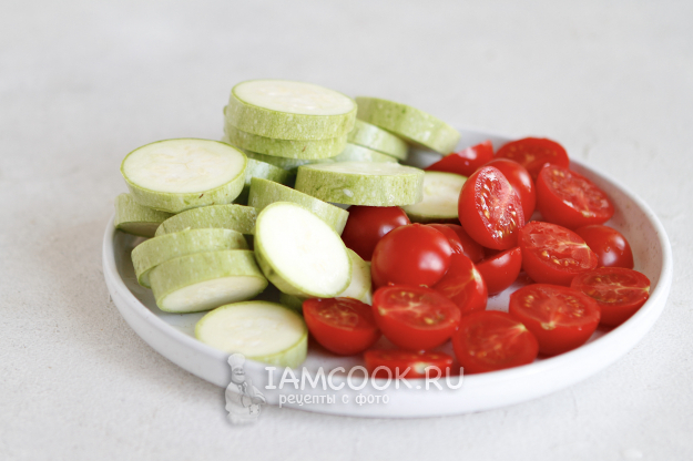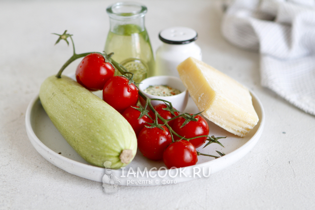 Давайте соберем все продукты и приступим к приготовлению кабачков с помидорами и сыром в аэрогриле.
