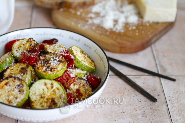 По готовности овощи перекладываем на блюдо. Берем любой сыр, который найдется у вас в холодильнике, у меня это пармезан, но можно взять российский или голландский, и щедро присыпаем.