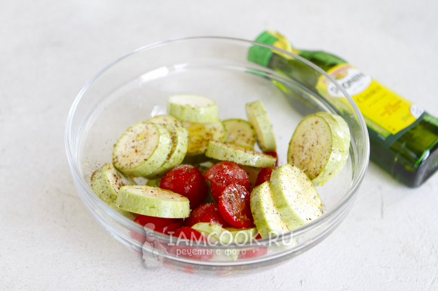 В чашу перекладываем овощи. 🥒 Слегка сбрызгиваем их маслом и добавляем соль с травами. Аккуратно все перемешиваем.