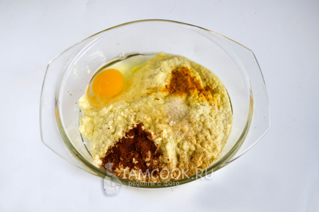 Переложите тесто в миску. Разбейте яйцо, добавьте соль, паприку, куркуму, растительное масло (1-2 ст.л.). Если яйца мелкие, то используйте 2 шт.