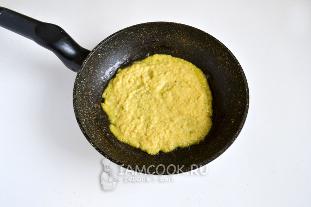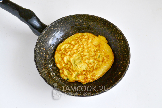 Разогрейте сковороду, смажьте небольшим количеством растительного масла и половником вылейте порцию теста. Тесто не растекается само по сковороде, поэтому тыльной стороной половника размажьте его по поверхности сковороды толщиной 4-5 мм.