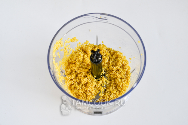 Утром воду с пшена слейте, еще раз промойте и переложите в чашу измельчителя.