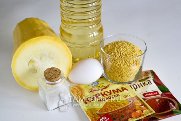 Соберите продукты для приготовления мягких блинов из кабачка без муки (с пшеном).