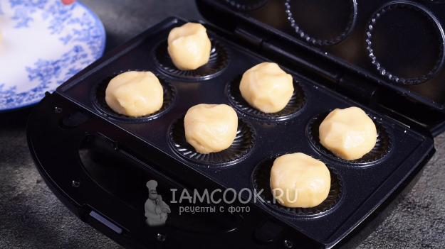 Разогрейте мультипекарь до необходимого уровня (у меня на устройстве загорается индикатор готовности) и смажьте один раз рабочие поверхности тонким слоем растительного масла. От общей массы теста отделяйте кусочки весом по 20 г, скатывайте из них шарики. Выложите шарики теста в каждую формочку и накройте мультипекарь крышкой.