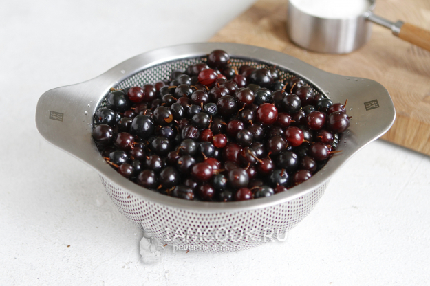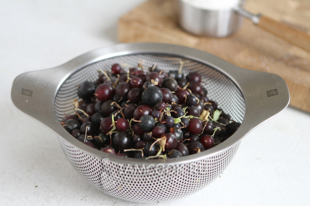 Ягоды черной смородины переберите, удалите веточки, листочки и промойте под проточной водой. Откиньте на дуршлаг и дайте воде стечь.