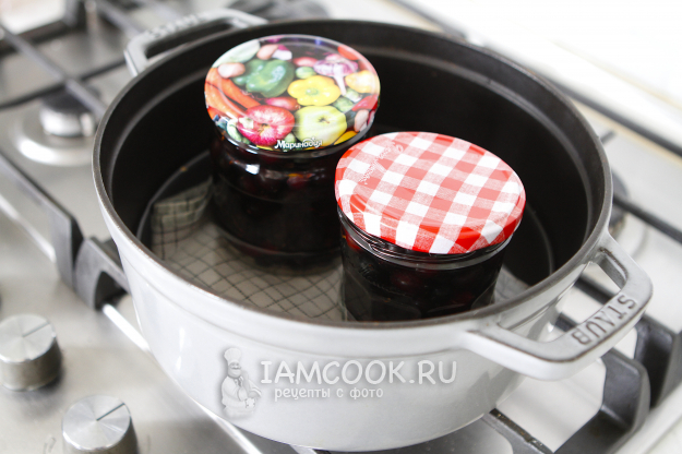 На дно широкой кастрюли положите полотенце и поставьте банки. Налейте в кастрюлю холодную воду до плечиков банок, доведите воду до кипения и стерилизуйте 10 минут на небольшом огне. Закатайте банки крышками и оставьте на столе до полного остывания.