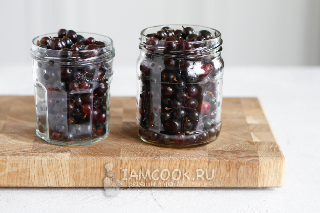 Банки с крышками хорошо промойте и простерилизуйте удобным для вас способом. Я стерилизовала в духовке 25 минут при 90°С. Разложите ягоды черной смородины по банкам.