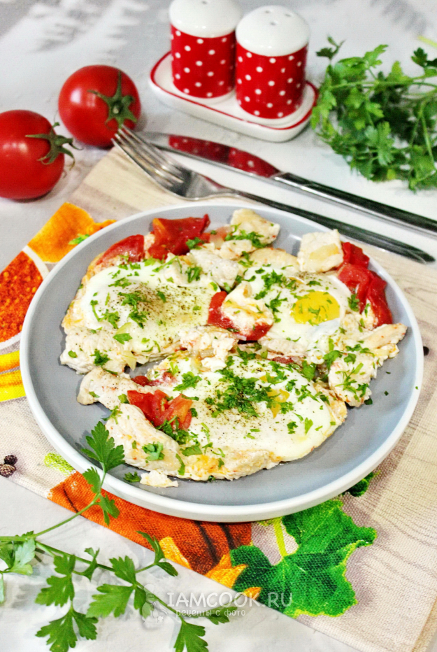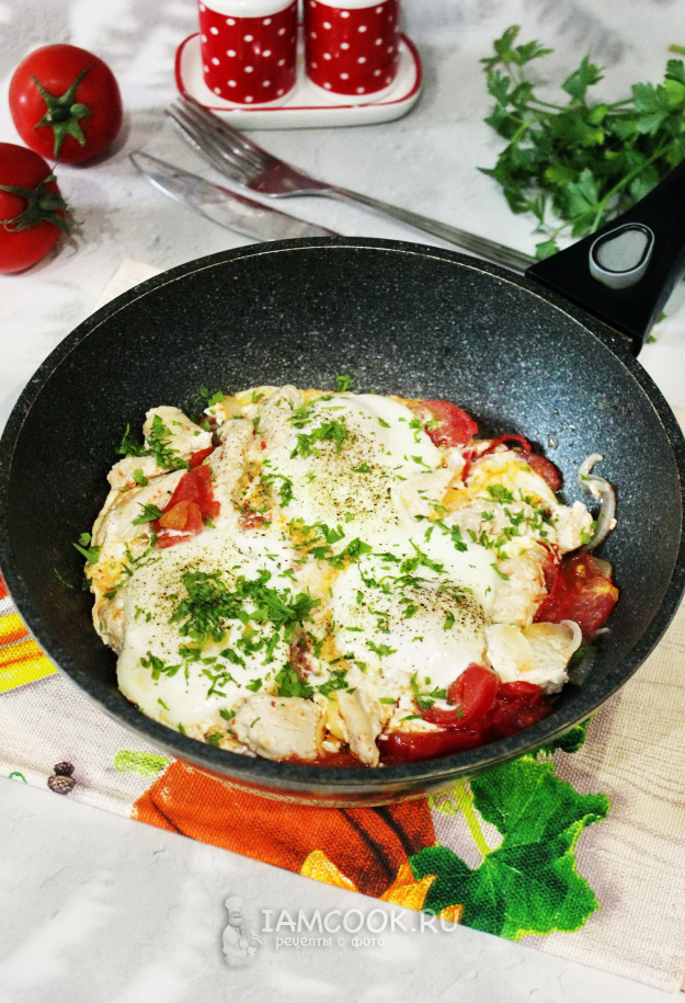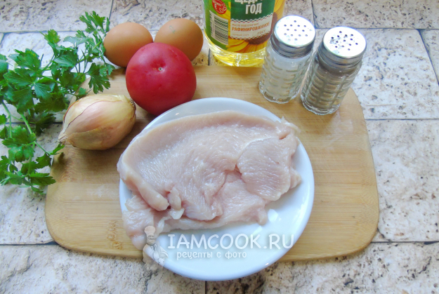 Соберите ингредиенты для приготовления яичницы с индейкой.