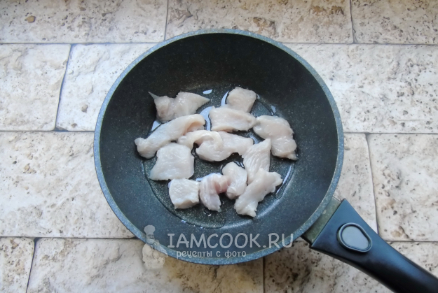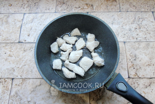 Филе индейки помойте и нарежьте небольшими кусочками. Выложите на горячую сковороду с растительным маслом.