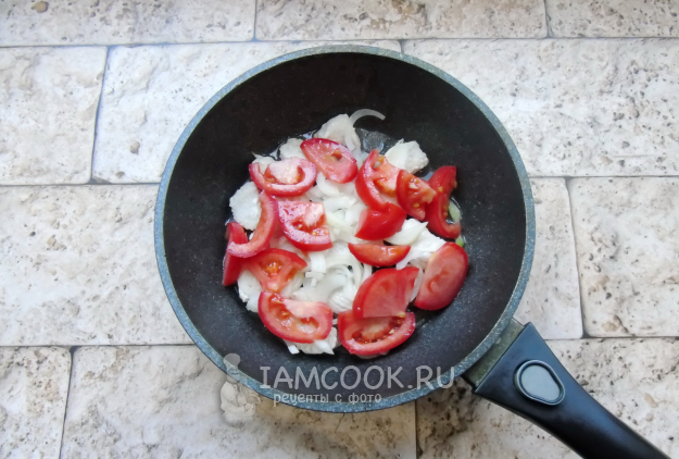 Репчатый лук очистите, помойте. Помидор помойте. Нарежьте овощи произвольно и добавьте в сковороду к индейке. Тушите овощи с индейкой, перемешивая, пока они не станут мягкими.