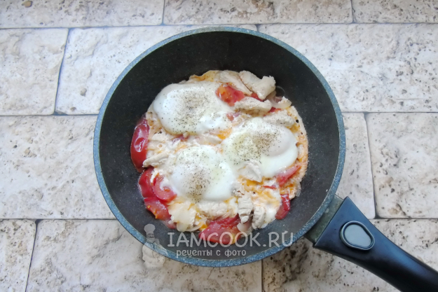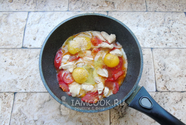 Разбейте в сковороду яйца. Посолите и поперчите по вкусу.