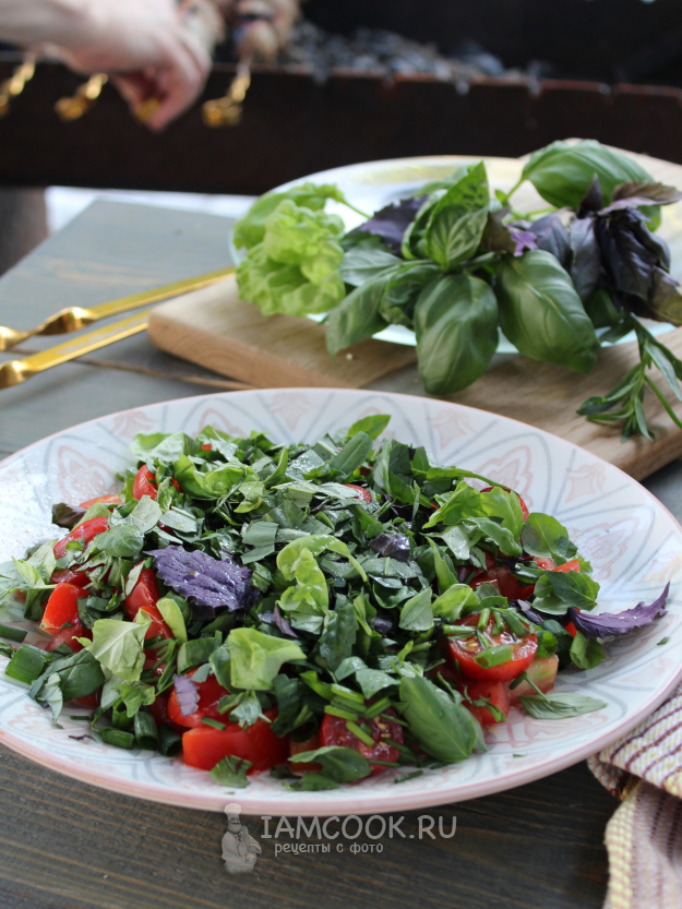 В летний сезон салат из своей свежей зелени готовлю, пока жарится мясо над углями.