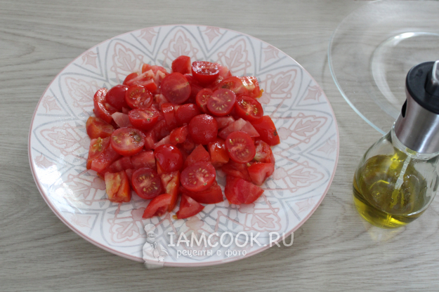 Зелень ополосните и обсушите. Помидоры в зависимости от их размеров и формы нарежьте подходящими кусочками: ломтики, кубики, половинки.