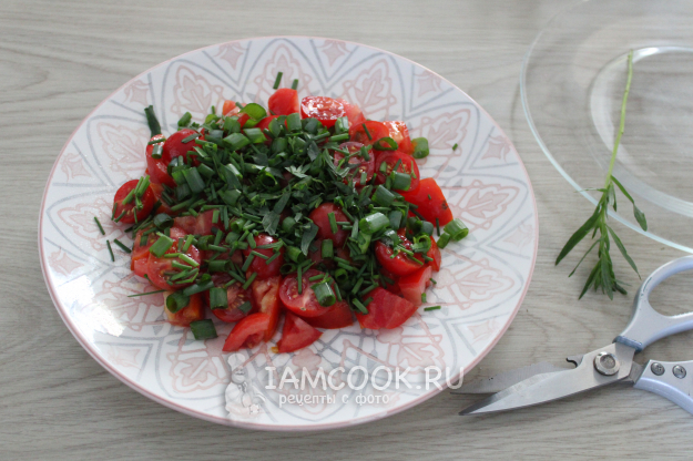 С тархуна/эстрагона снимите листочки, т.к. его стебель для салата не используется. Соберите в пучки их, перья лука и шнитт-лука. Нашинкуйте ножом или постригите специальными ножницами поперёк и бросьте на помидоры. Слегка посолите и сбрызните оливковым маслом.
