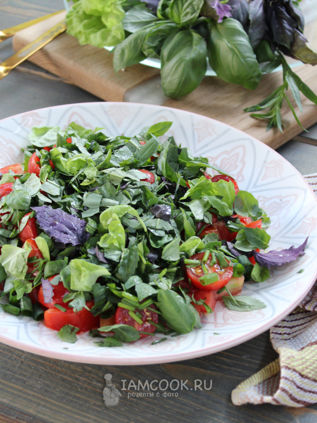 Для салата со свежей зеленью и помидорами подготовьте ингредиенты по списку к рецепту. Количество и состав могут варьироваться.