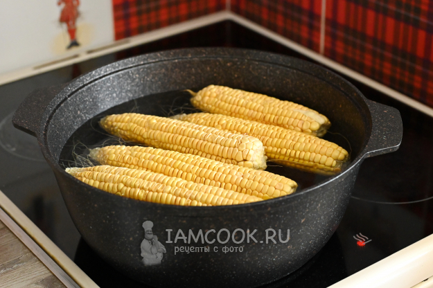 Вскипятите в кастрюле воду, добавьте по вкусу соль. И ещё я всегда добавляю при варке кукурузы сахар, так она гарантировано получается сладкой. В кипящую воду положите початки кукурузы и варите их на среднем огне до готовности.
